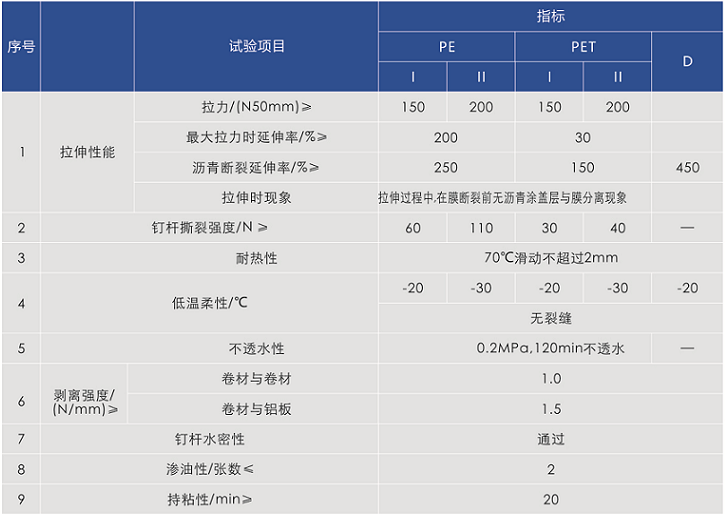 产品按有无胎基增强分为无胎基(N类)、聚酯胎基(PY类)。N类按上表面材料分为聚乙烯膜(PE)、聚酯膜(PET)、无膜双面自粘(D),PY类按上表面材料分为聚乙烯膜(PE)、细砂(S)、无膜双面自粘(D)。产品按性能分为l型和型,卷材厚度为2.0mm的PY类只有1型。