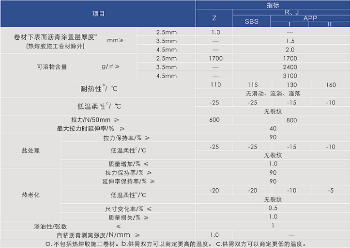 ·自粘卷材厚度为2.5mm;热熔施工卷材分为3.5mm、4.5mm;热熔胶施工卷材分为2.5mm、3.5mm。卷材幅宽1m,卷长分别为7.5m、10m、15m、20m。